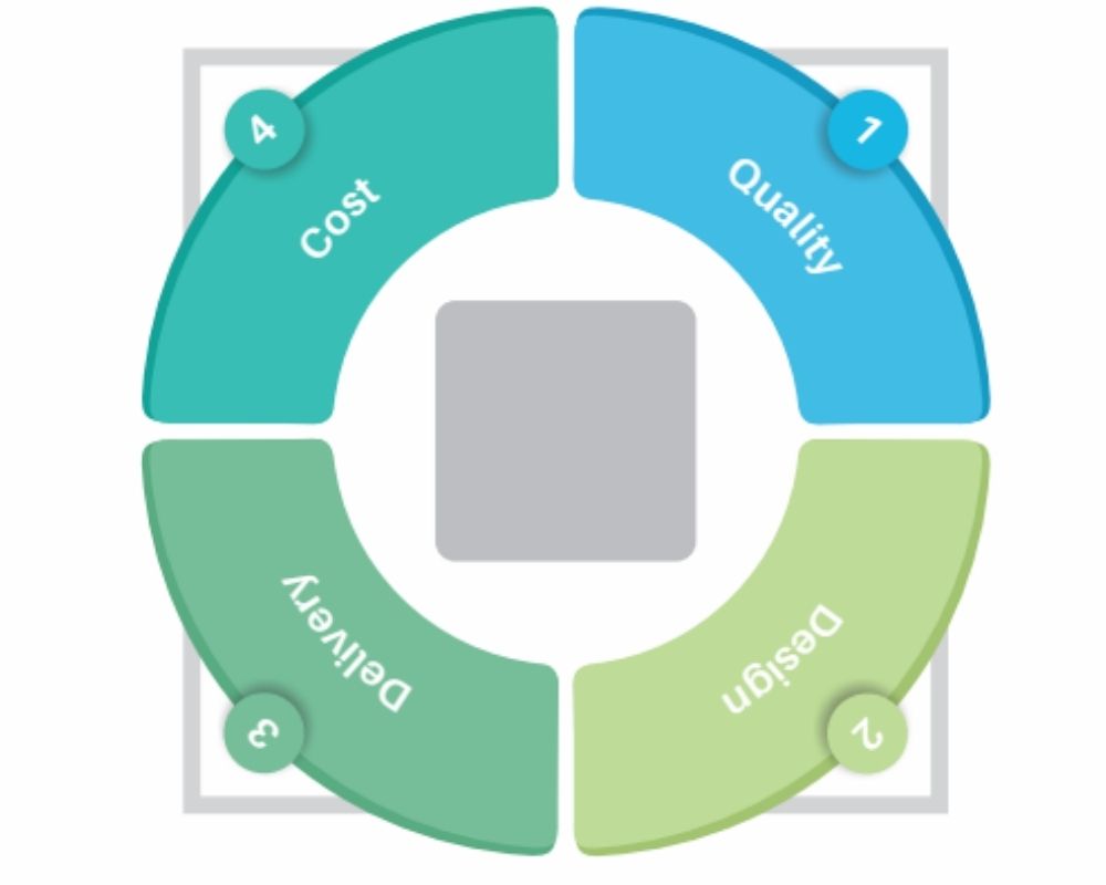 We at Fabastra are committed to give you one of the best products and services with our unique square matrix, consisting of Quality, Cost, Design and Delivery. Although we deal with each one separately in a well defined way, the balance is maintained throughout the process, to give you the most desirable product ! Perfect Square of Quality, Cost, Delivery and Design shows the trade-offs inherent in any project. The square illustrates the relationship between four primary pillars in a project : Quality : Represents the fit-to-purpose that the project must achieve to be a success Delivery : The available time to deliver the project Cost : Represents desired resources available Design : Illustrates the research or methodological work Involved to complete the project